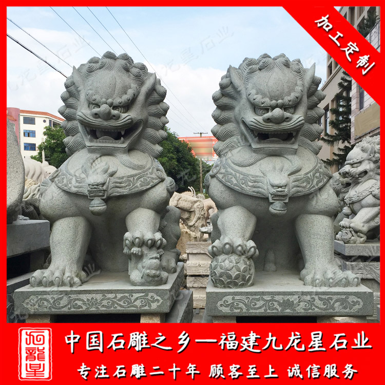 青石獅子,青色的巖石雕刻的石獅子。青石又可分為四川青、羅源青等,無論是哪種青石表面都呈現(xiàn)青綠色,顏色復古樸素?;莅彩硞儠捎檬止さ窨糖嗍{子,這樣的青石獅子線條更具流動感、更為形象、生動。