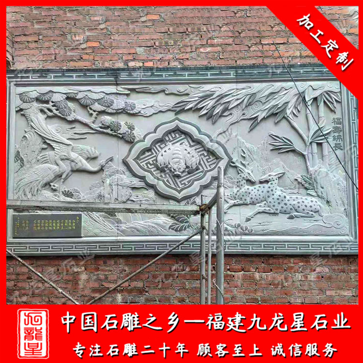 青石浮雕壁畫雕刻面鹿:與"祿"字諧音,以象征升官晉爵、高官厚祿。青石浮雕壁畫雕刻魚:魚和"余"諧音,常與水塘荷蓮組成圖案,象征金玉滿堂或連年有余;鯉魚騰浪,以象征科舉及第、金榜題名。這兩款青石浮雕壁畫也是宗祠、祠堂很常見的青石浮雕壁畫圖案。