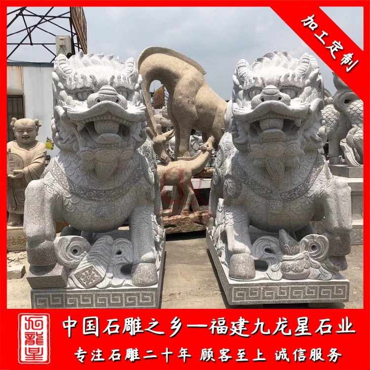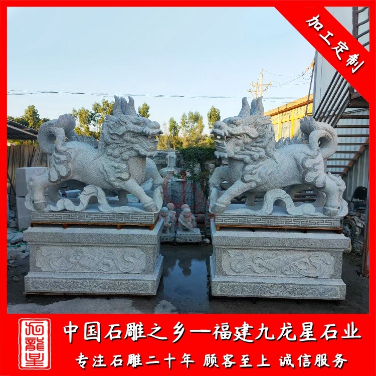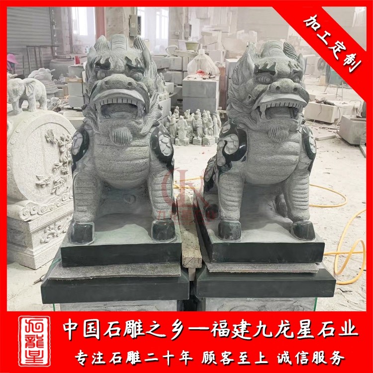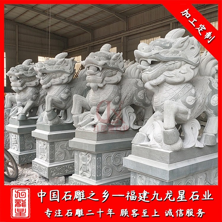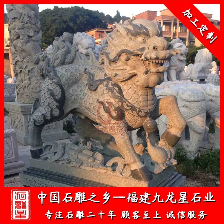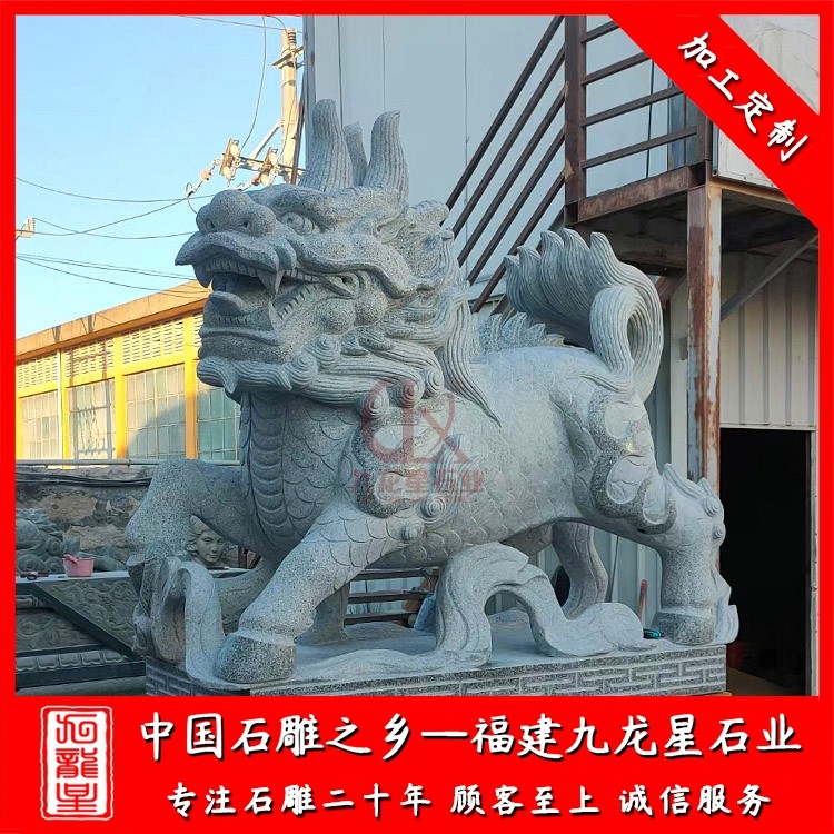花崗巖石雕麒麟通常是以一對的形式出現(xiàn),擺放在景區(qū)、寺廟、別墅、酒店門口、工廠公司等場所。