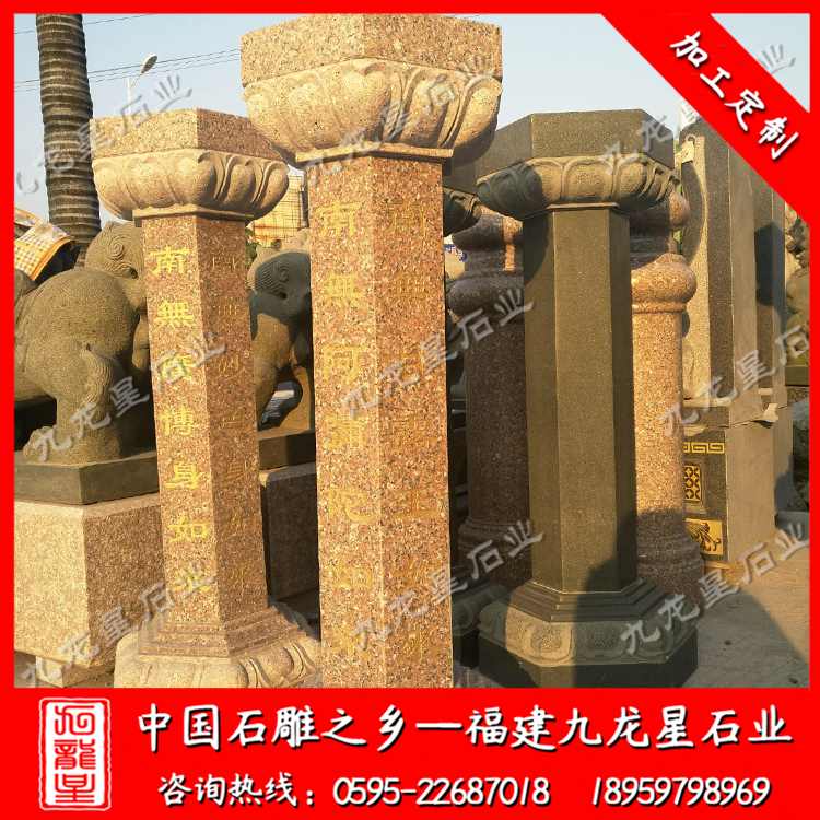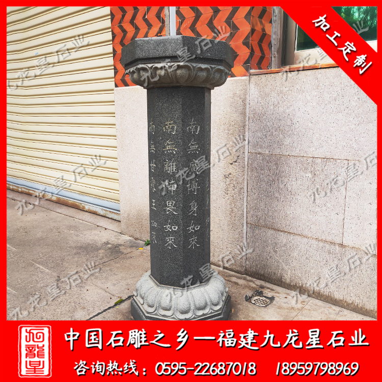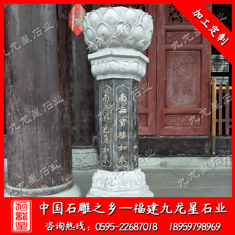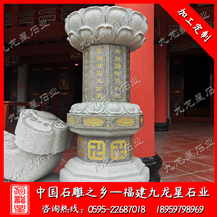 在外觀形式上,不同的寺院一般也會(huì)定做極具個(gè)性化的施食臺(tái)。出食臺(tái)一般為石柱,一般由柱礎(chǔ)、柱身、承露盤三個(gè)部分組成。最常見的施食臺(tái)造型為底座是一塊四邊形的板,上面是一個(gè)單層的俯蓮臺(tái),蓮花瓣會(huì)相對(duì)較大,通常這種蓮花瓣會(huì)做成雙瓣的,更飽滿許多。柱身部分則雕刻七寶如來(lái)大名以及本師釋迦牟尼的法名,一般這些雕刻的文字都會(huì)上好金漆。有些寺院需要定制符合寺廟風(fēng)格的,也只是在這種表現(xiàn)方式上進(jìn)行一些調(diào)整而已。當(dāng)然有些調(diào)整比較明顯的也有,那就是把底座調(diào)高,內(nèi)容更加豐富,比例突破常規(guī)造型。也有一些要求比較高的寺院,會(huì)將出食臺(tái)的八面都雕刻上對(duì)應(yīng)的佛像法相,法相下面是對(duì)應(yīng)的佛像名稱。施食臺(tái)的承露盤一般會(huì)由三層蓮花瓣疊加而成,呈仰蓮形態(tài),大小直徑與底座相差無(wú)幾。