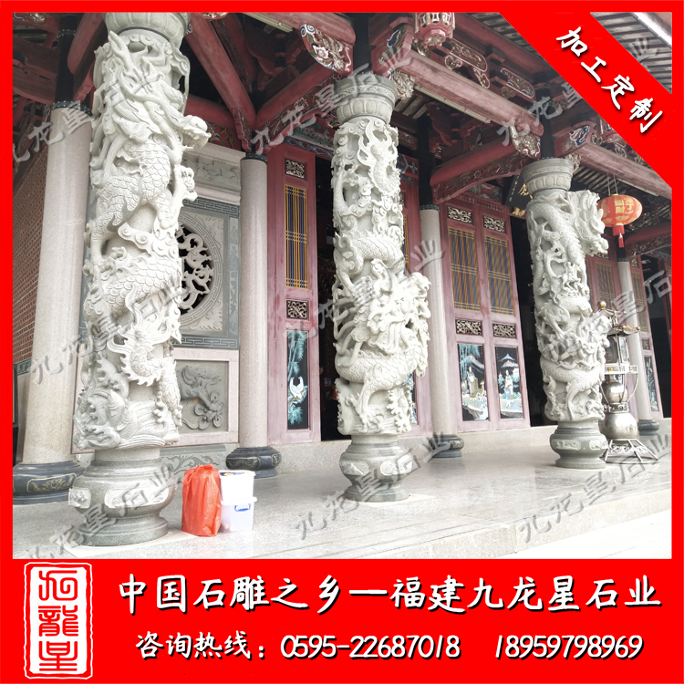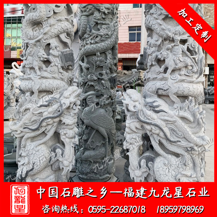 石雕龍柱被稱為石雕圖騰柱,有的地方稱作盤龍柱或者文化柱等。石雕龍柱以整根石材雕刻而成,一般出現(xiàn)在城市廣場,公園和廟宇大殿內(nèi),擺放的位置都比較明顯,尺寸高大醒目,點綴出了一道格外美麗的代表性裝飾。下面由石雕龍柱廠家——福建九龍星石業(yè)發(fā)展有限公司對石雕龍柱樣式做個簡單的介紹。石雕龍柱的擺放講究。在多個石雕文化柱柱體一字排列時,近視的效果會給人感覺石雕文化柱之間的虛空間像一道透明的屏障,即分割開公共空間與外部空間,又形成一個開放的大門,透過它可以清晰低看到后面的其他景觀。半圓弧形狀擺放的布局是文化柱和主雕結合的方式,兩者之間相呼應形成一個整體的空間領域。
