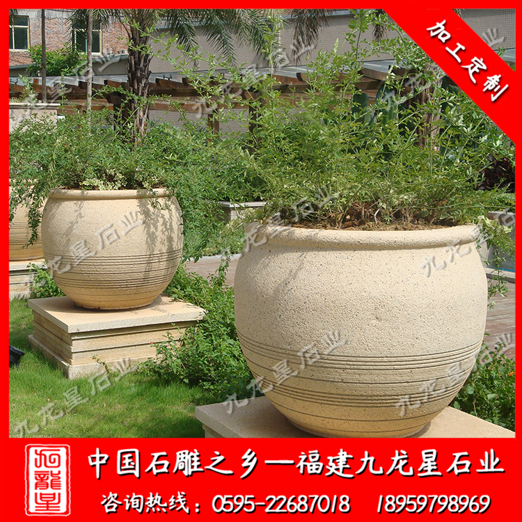 現(xiàn)代景觀花缽在制作過程中常用到的素材都是天然石材,一般為花崗巖和少數(shù)大理石、砂巖,其中以花崗巖為常見。常用的花崗巖石材種有黃銹石、黃金麻,這兩種石材的顏色與黃金的顏色接近,有財(cái)寶的象征寓意,對(duì)于偏愛象形諧音、講究風(fēng)水的中國(guó)人來說,對(duì)之很喜歡。而這種顏色又與土地泥巴的顏色相接近,很好打理,因此在建筑景觀中使用頻率很高。常見到的大理石一般為米黃系列大理石,這類大理石由于石材價(jià)格昂貴,通常會(huì)在一些相對(duì)髙檔的小區(qū)中使用,以埃及米黃、西班牙米黃大理石花缽常見。當(dāng)然了,有時(shí)候?yàn)榱耸沟没ɡ徟c整體環(huán)境能夠搭配得更美觀,有時(shí)也會(huì)用一些其他石材的花缽,比如漢白玉花缽、芝麻白花缽、楓葉紅花缽等等。