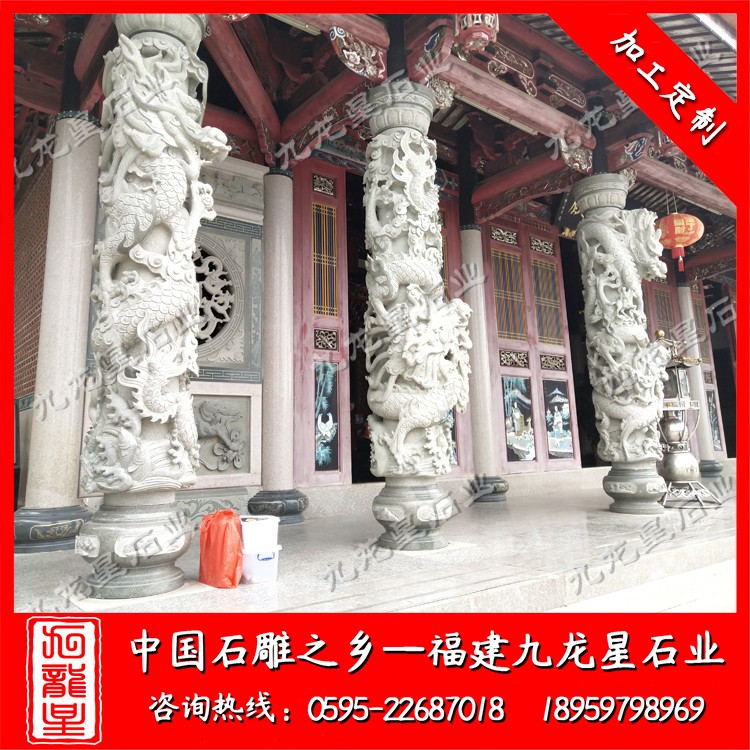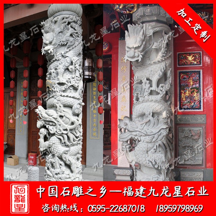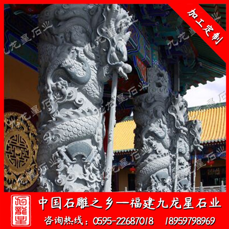 石雕龍柱通常采用青石、漢白玉,芝麻白,銹石,蝦紅等石材加工?,F(xiàn)在的九龍星工匠雕刻工藝也是越來越精湛,所以說古建筑寺廟龍柱的造型也是越來越美觀,造型也越來越合理,這些的改變導致裝飾性也更加的具有競爭力。石雕盤龍柱在中國傳統(tǒng)民間工藝種類繁多,且博大精深,技藝精湛。我國古建筑寺廟龍柱裝飾藝術隨著時代的發(fā)展,其形式和特點也在不斷的發(fā)生演變。