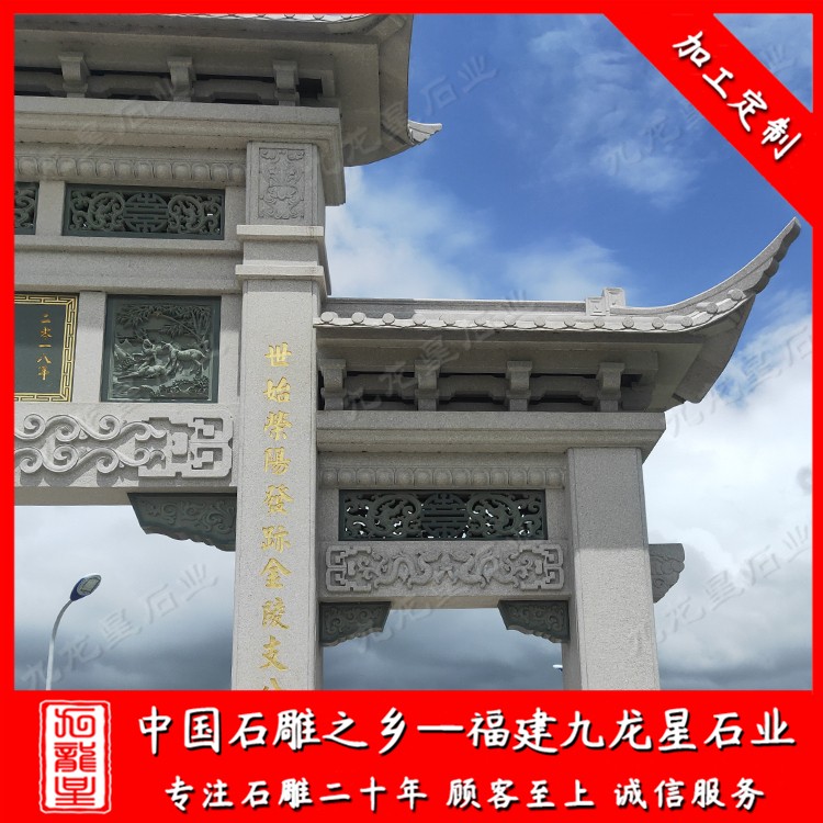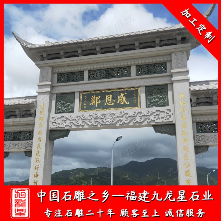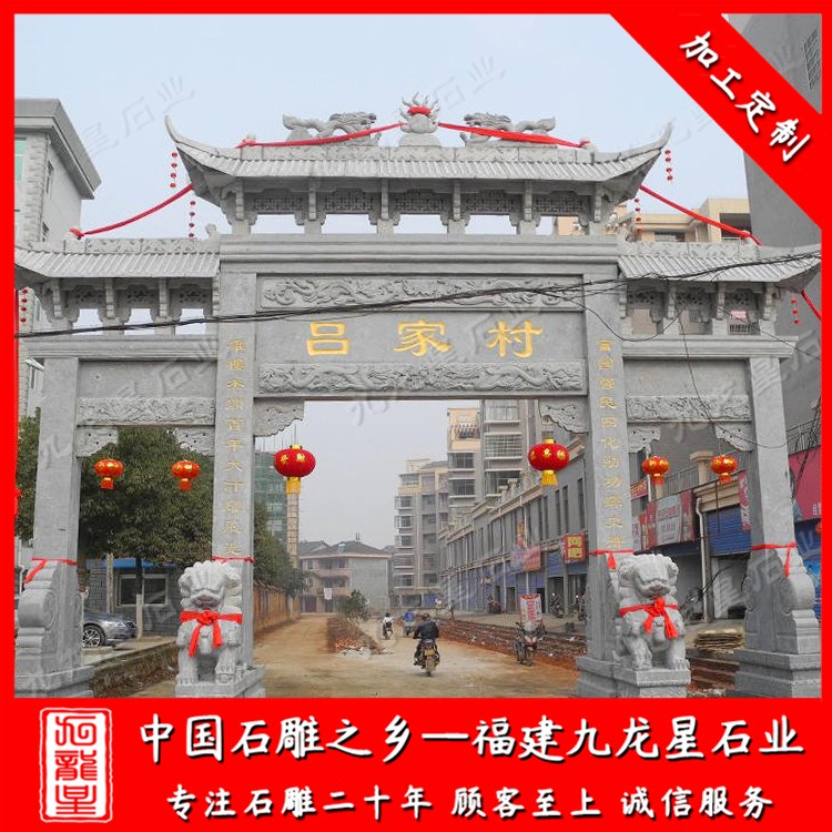 村入口牌坊的款式很多,有古典樸素風(fēng)格、有現(xiàn)代簡約風(fēng)。而今村入口牌坊新農(nóng)村新面貌的一部分。廣大客戶如果有需要可聯(lián)系福建九龍星石業(yè)發(fā)展有限公司。公司為石牌坊廠家,有著二十多年的石牌坊設(shè)計(jì)加工安裝經(jīng)驗(yàn),村入口牌坊款式多樣。