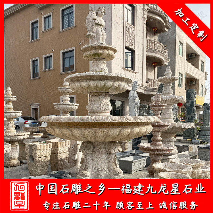 大號(hào)型石雕噴泉大致可以分為歐式石雕噴泉和中式石雕噴泉兩種款式。隨著人們生活水平的日益提高,大號(hào)型石雕噴泉在我們的生活中也是經(jīng)常看到的。廣場(chǎng)、園林、小區(qū)等地方都不難看到它的身影,甚至一些高檔的別墅庭院里也會(huì)有建造一大號(hào)型石雕噴泉。