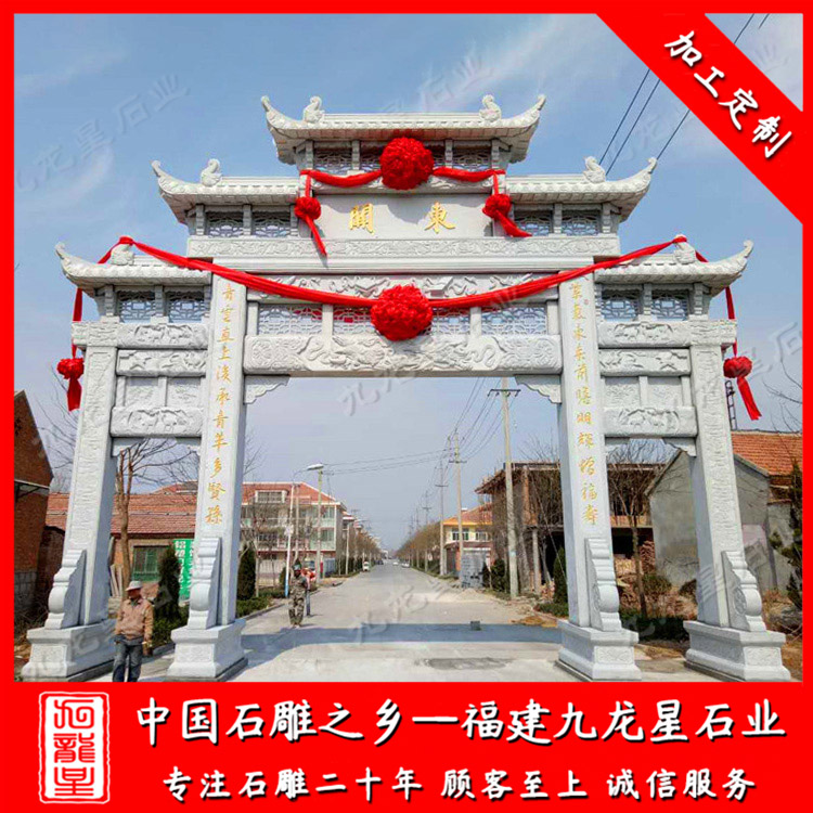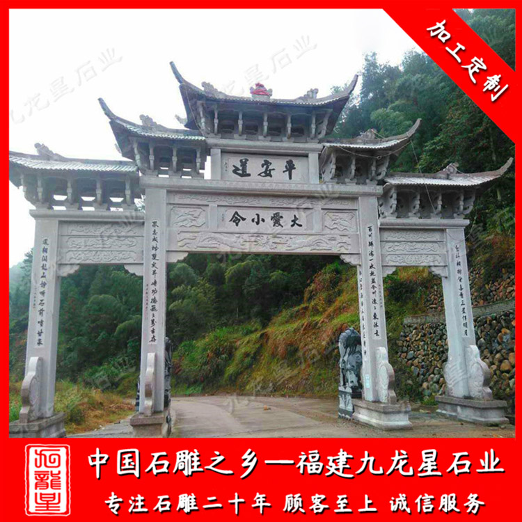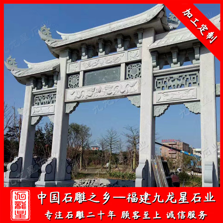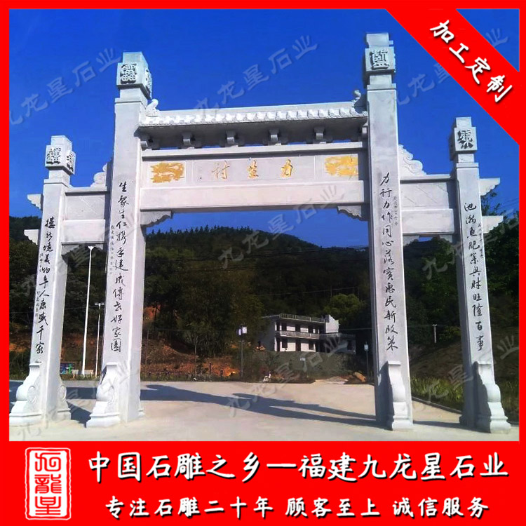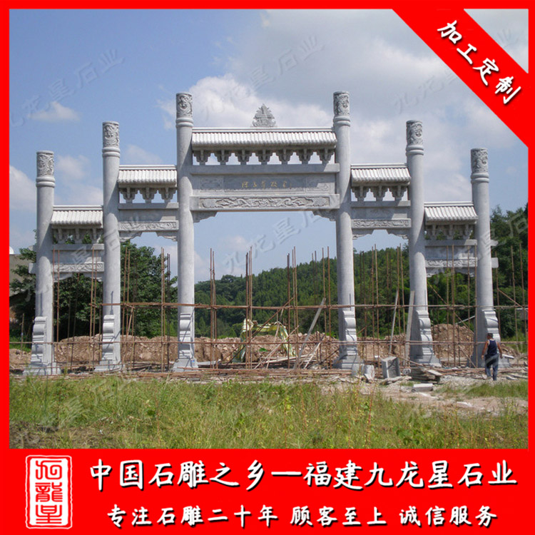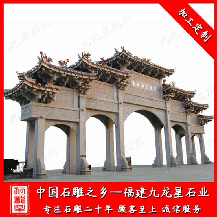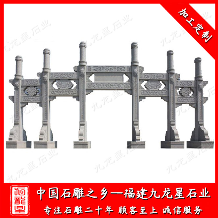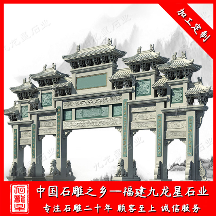 九龍星是石牌坊門樓廠家,從事石雕牌坊加工制作20多年,大號型石雕牌坊設(shè)計加工經(jīng)驗多。石牌坊門樓、大號型石雕牌坊款式多樣,有景區(qū)牌坊石雕圖片 村莊石牌坊圖片、也有寺廟山門牌坊,可來電要圖欣賞。石牌坊門樓材質(zhì)可以為花崗巖、青石、漢白玉等等,望廣大新老客戶前來參觀考察和選購。