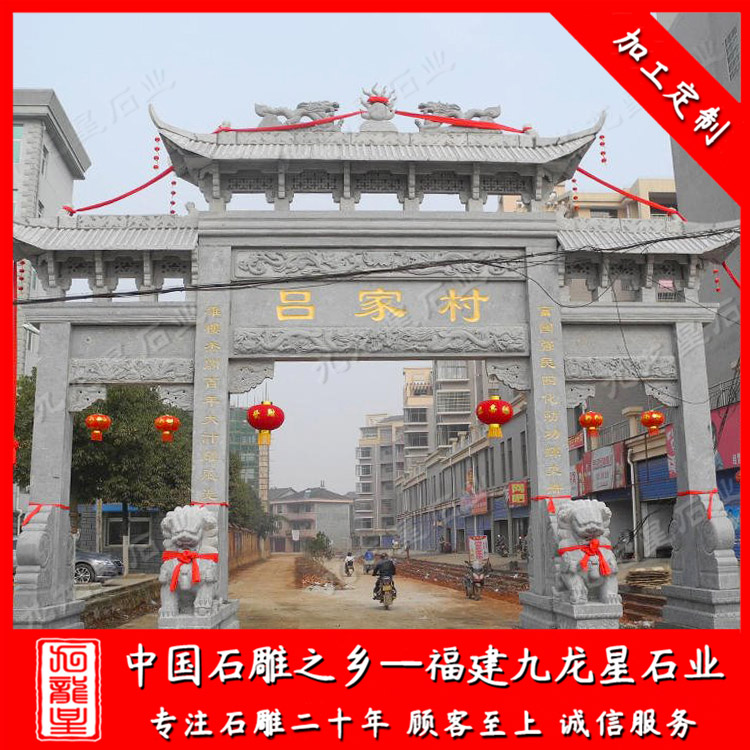 景區(qū)石雕牌坊和村莊石牌坊廠家很多集中在福建惠安,福建九龍星石業(yè)發(fā)展有限公司位于--福建惠安,是惠安石牌坊門樓廠家,九龍星人相信每塊石頭都獨馥藝術(shù)氣息,所以善用千年文化雕鑿工藝的研究、傳承、融合和發(fā)揚,使石雕作品承載藝術(shù)文化、體現(xiàn)更多社會價值。