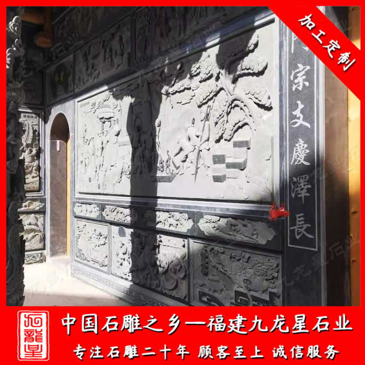 石雕浮雕墻作為祠堂建筑的裝飾,其主題的雕刻可以很接地氣,讓更多人了解祠堂宗廟文化。浮雕墻雕刻內(nèi)容有很多種,每一種都會有其寓意所在,其所蘊含豐富的文化內(nèi)涵以及深厚的歷史底蘊,也使得整座宗廟更加的莊嚴肅穆,也承載著人們對祖先思念敬慕的深厚情感。