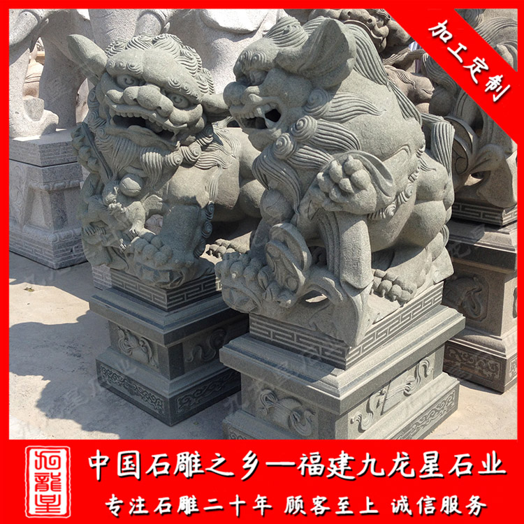 一對(duì)石獅子雕塑,作為漢族傳統(tǒng)文化中常見(jiàn)的辟邪物品,同時(shí),石獅子也有著彰顯權(quán)貴的象征。石獅子雕塑作為一種建筑的裝飾,大多用于宮殿、廟觀、衙署(古代的政fu)以及高級(jí)guan員、和富商的住宅門口。而在現(xiàn)代,一般石獅子則多放在一些商店,銀行,住宅的門口。