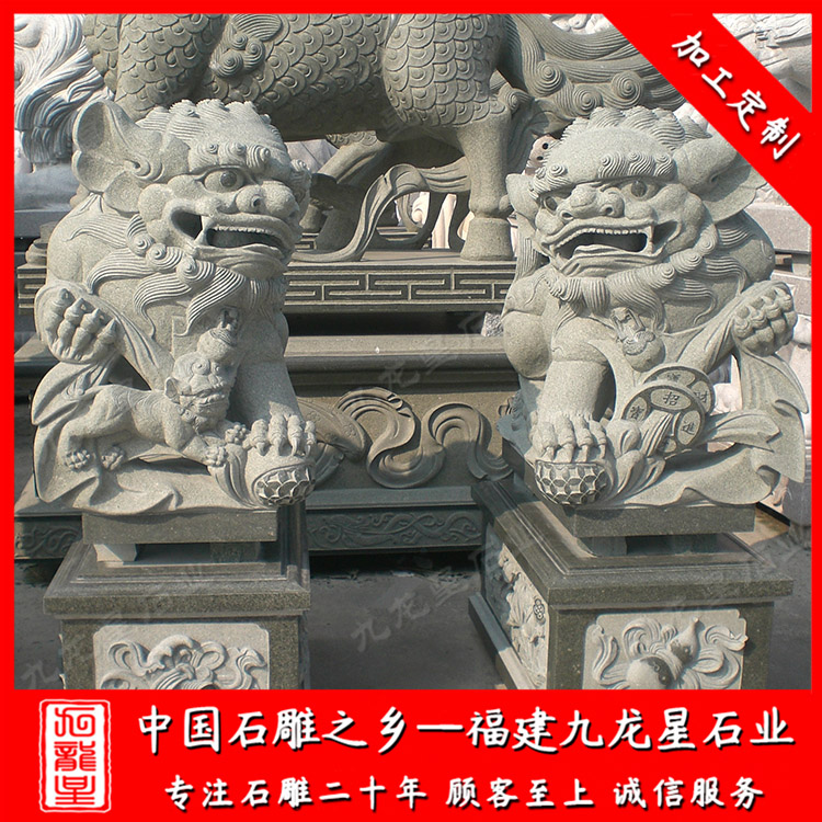 一般公獅子擺放左邊,同時(shí)爪下玩彩球,表示張燈結(jié)彩、盛世太平,若球上刻有銅幣,則還有求財(cái)之意;母獅子擺放在右邊,爪下?lián)崦—{子,以示家庭和睦、子孫繁盛。