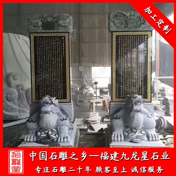 自古以來龜駝碑雕刻是用來記錄敘事的,是龍生九子之一。石雕龜馱碑在風(fēng)水中常用來擋煞和招財,龜馱碑由碑首、碑身和碑座三個部分組成,雕刻精美,碑文刻制精致,字字有姿,有典型的民族風(fēng)格。