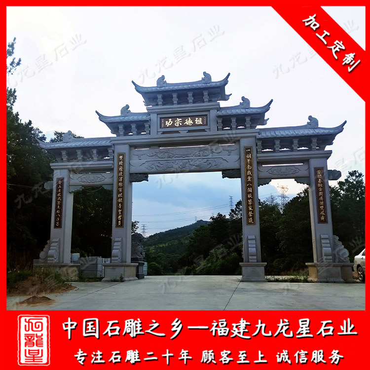祠堂石牌坊承載了一個(gè)家族的血脈親情,它不僅僅是建筑搭配,也是傳承文化的寓意。祠堂石牌坊不會(huì)做太大,以單門牌坊和三門石牌坊為主。在家祠門口設(shè)立一座牌坊,可以突出整個(gè)姓氏家族的標(biāo)志。
