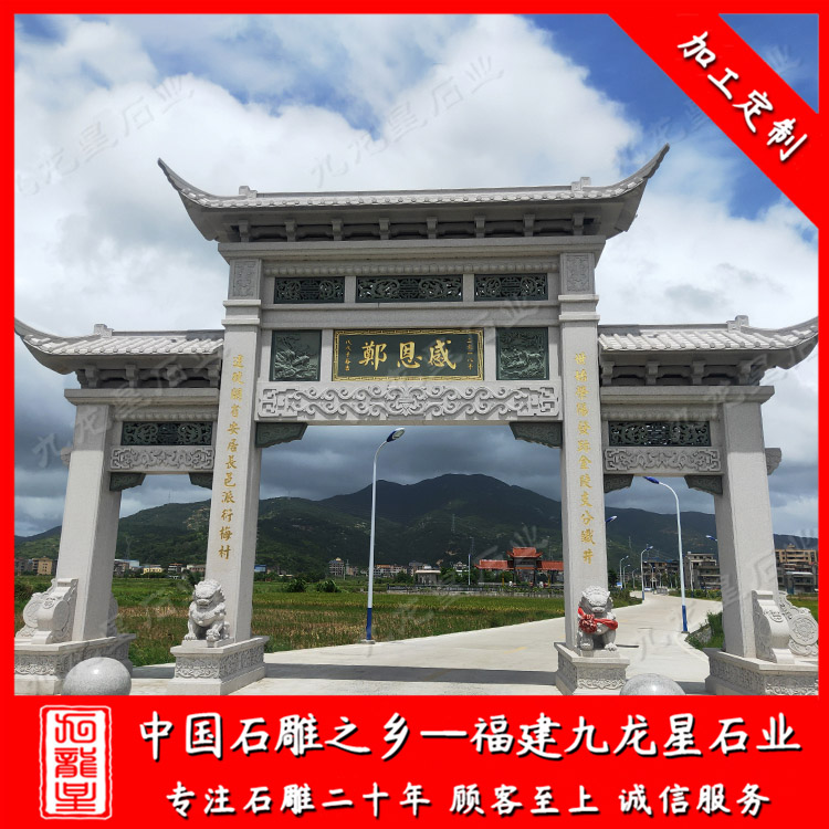 石雕村牌坊廠家雕刻的村口石牌坊、進(jìn)村石牌坊大多安裝在村莊入口的主干道,是整個(gè)村莊的門面。一座精美的村口石牌坊、石雕村牌坊不僅是村莊、新農(nóng)村的標(biāo)志,還可以體現(xiàn)全村的文化氛圍、生活水平等等。