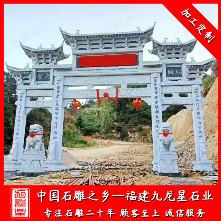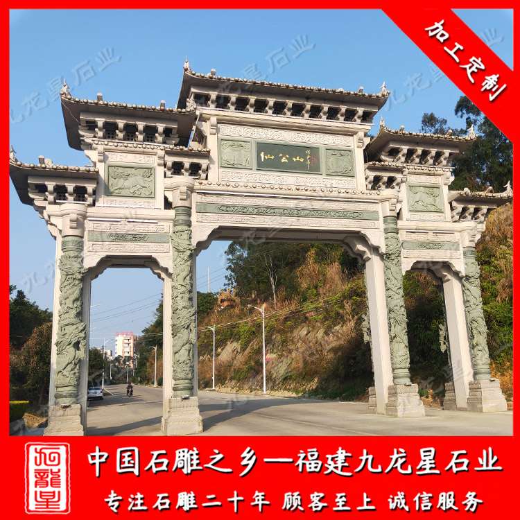 惠安石雕牌坊廠家雕刻的寺廟石雕山門牌坊、三門石牌坊采用花崗巖、青石、大理石等材質(zhì)雕刻加工制作,高度有8米、10米、11米、12米、13米等等,寺廟石雕山門牌坊直徑有10米、11米、12米、13米、15米不等,按照寺廟入口大門的實(shí)際情況而定做。九龍星石業(yè)常年加工批發(fā)石牌坊,款式多樣、工期快,歡迎廣大客戶前來定制。