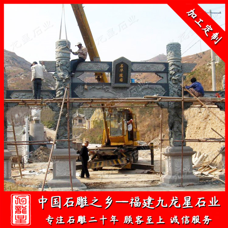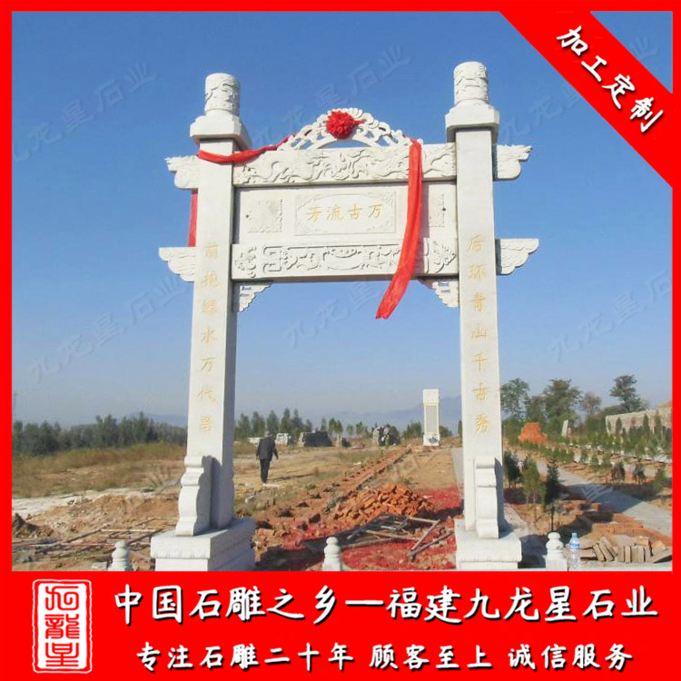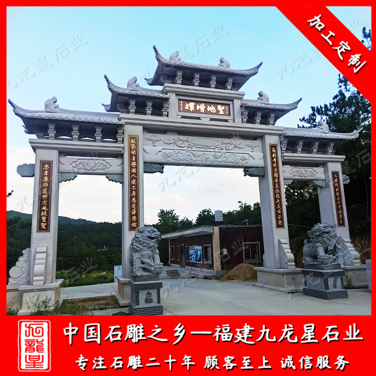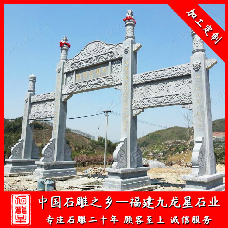 九龍星石業(yè)從事石雕行業(yè)二十多年,常年加工批發(fā)石牌坊、有景區(qū)石雕牌坊、寺廟石雕牌坊、公墓石牌坊、墓園石牌坊、村牌坊等等,歡迎咨詢我們定做。