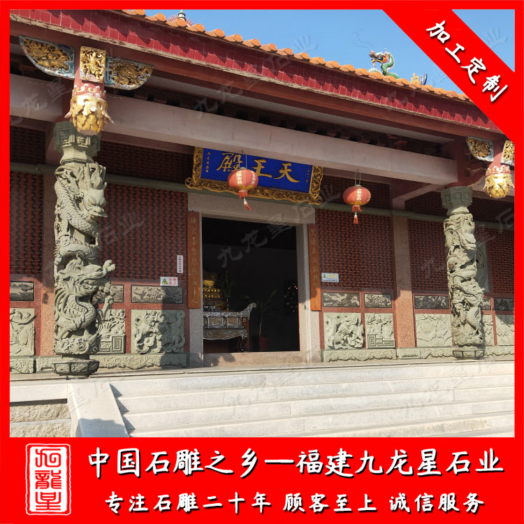 石雕龍柱的雕刻方法主要是浮雕,龍柱上雕刻著條形神,盤旋在柱上栩栩如生。寺內(nèi)的龍柱多以青石雕刻。與其他的石材相比較,青石石材青苔類綠與古寺廟建筑設計風格很像,另外青石石材密度較低,雕刻實際效果比較好。龍是中國的圖騰,在古典建筑中放置幾根龍柱,增加古典氣息。