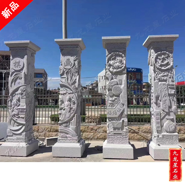 石雕文化柱通常被安裝在景區(qū)入口、廣場公園、寺廟寺院等場所。石雕文化柱廠家雕刻采用的石料有芝麻白、芝麻灰、銹石、漢白玉、青石、大理石等等。
