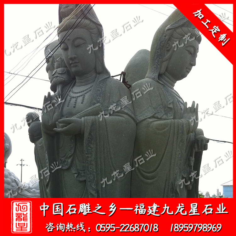 在石雕觀音造型中,石雕四面觀音的形象也是相對比較普遍的。石雕四面觀音分別是凈瓶觀音、送子觀音、阿耨觀音、持經(jīng)觀音合為一體,是經(jīng)過局部分塊鍛造、精密無縫焊接和整體吊裝拼接組合完成的,具有極其復(fù)雜的技術(shù)工藝性和極高的藝術(shù)價值。代表著平安、傳承、吉祥、智慧等美好寓意。
