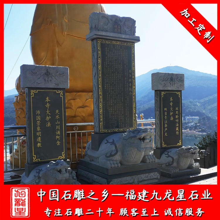 寺院石碑是我國石碑中一個(gè)重要的組成部分,寺院石碑是屬于功德碑,紀(jì)念碑,他有著悠久的歷史,幾乎滿座寺院都有石雕龜馱碑或龍頭碑。