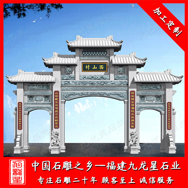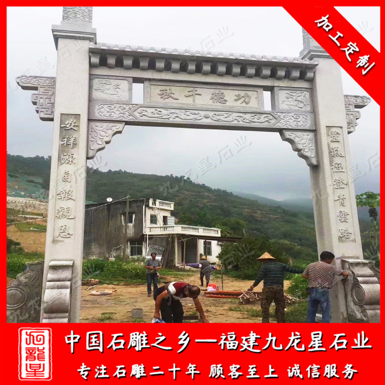 農村牌坊主要以石牌坊為主。農村石雕牌坊堅固美觀安全,相比于水泥牌坊、木牌坊、輕鋼牌坊具有很多優(yōu)勢。
