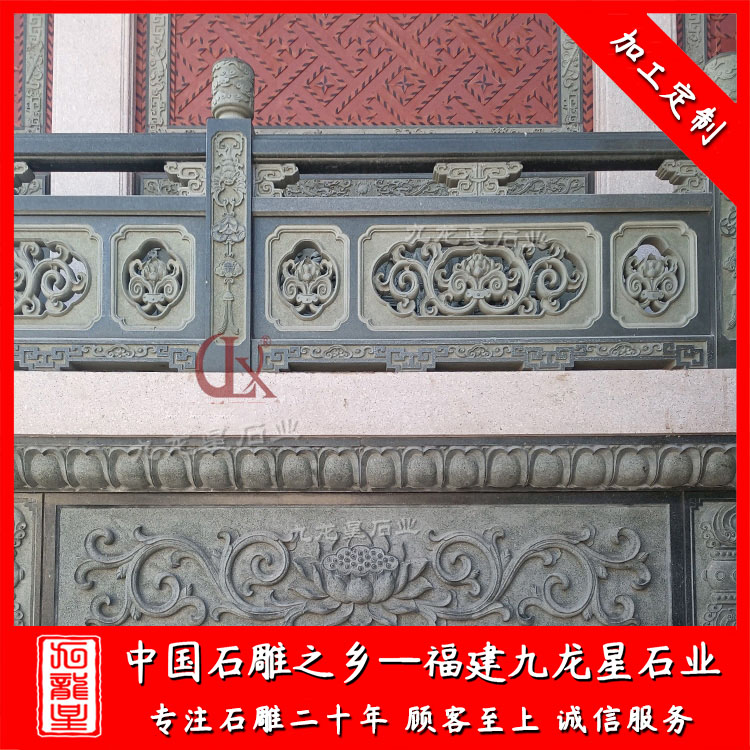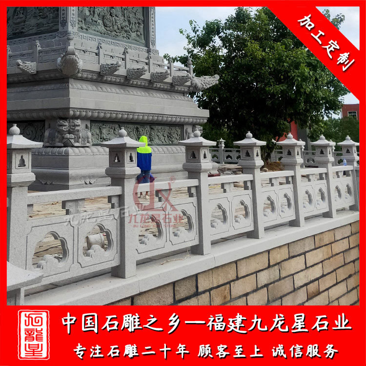 寺廟石材欄桿護(hù)欄有采用古香古色的青石雕刻而成的,也有采用質(zhì)地堅硬的芝麻黑、芝麻灰等花崗巖石材加工雕刻。