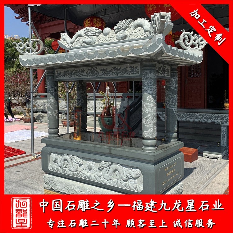 福建石雕香爐供桌的定制款式豐富多樣,每一個款式都有其獨特的特點和寓意。首先,我們來欣賞一款以龍紋為主題的香爐供桌。這款香爐以華麗的龍紋為裝飾,龍紋栩栩如生,根根探云騰空,似乎要從香爐上升騰而出。龍在中國文化中被視為吉祥和權勢的象征,因此這款龍紋香爐供桌在氣勢上十分雄健而富有力量感。此外,龍紋香爐供桌的雕刻細膩,線條流暢,每一處的細節(jié)都表現(xiàn)出福建石雕工藝的獨特魅力。